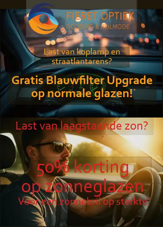 Bij aankoop van een correctiebril ontvang je een gratis upgrade naar blauwfilterglazen én 50% korting op zonnebrilglazen op sterkte.
